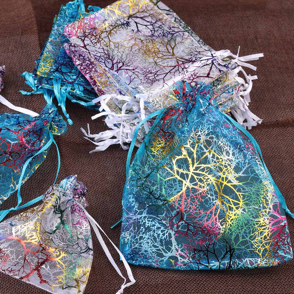 25pcs/lot 50pcs/lot Gift Bag Jewelry Packaging Organza Drawstring Bag Multi-size Colorful Trees Printing Party Wedding Candy Bag