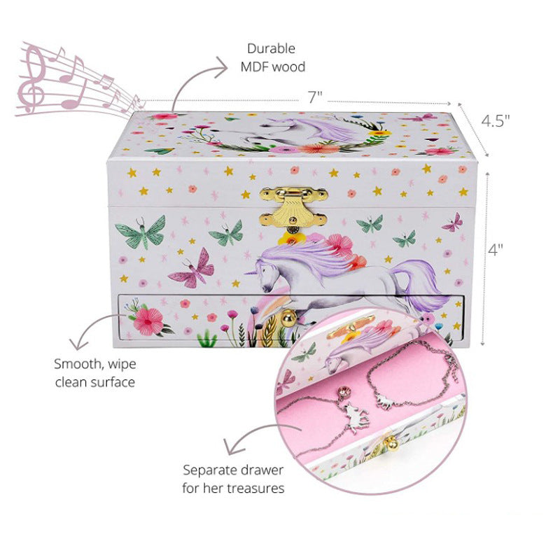 In conclusion, our Birthday Gift Jewelry Multifunctional Jewelry Storage Box is the perfect choice for those seeking a unique and practical gift. Its high-quality wood construction, Anime cartoon pattern, and Unicorn color make it a delightful addition to any jewelry collection. Surprise your loved ones with this music storage box, and let them experience the joy of organizing their jewelry in style.