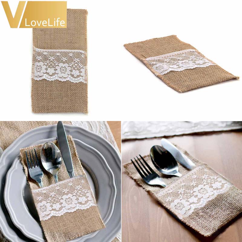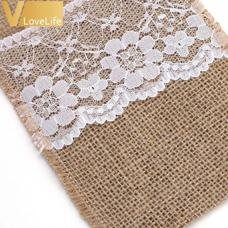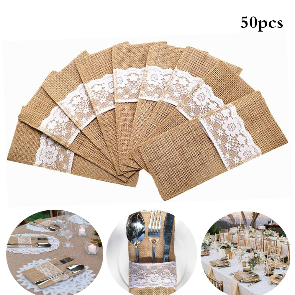 50pcs Burlap Lace Cutlery Pouch Tableware Hessian Rustic Jute Christmas Decor Wedding Table Decoration Wedding Party Bridal