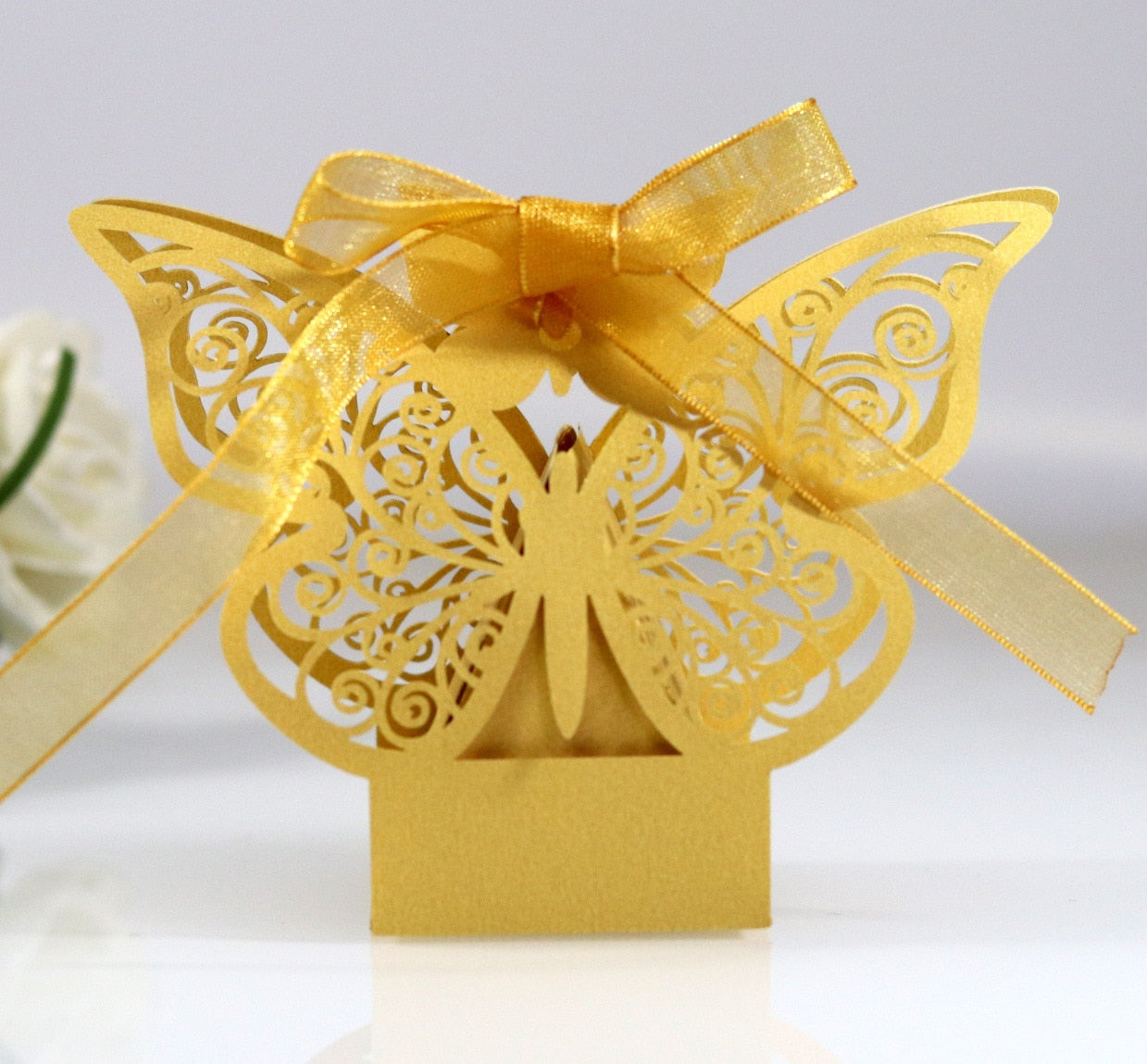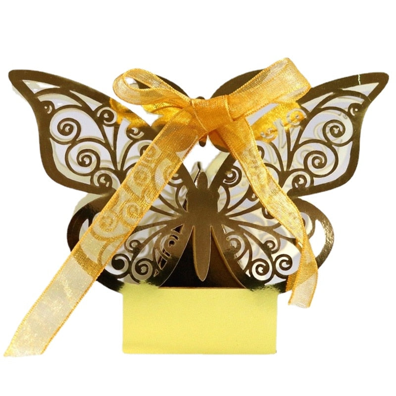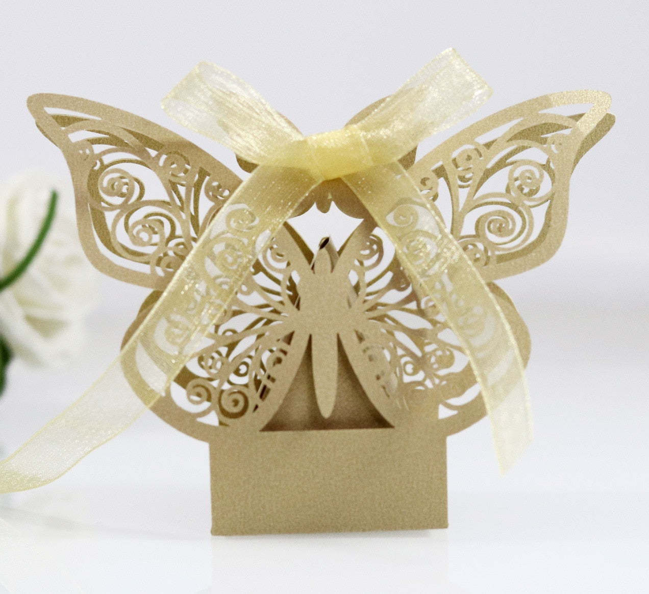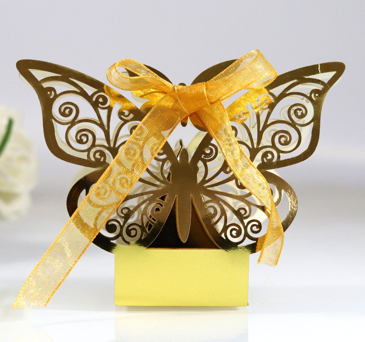 10pcs Laser Cut Hollow Chocolate Candy Box Gold Butterfly Packaging Boxes Wholesale with Ribbons Wedding Party Favors Wrapping