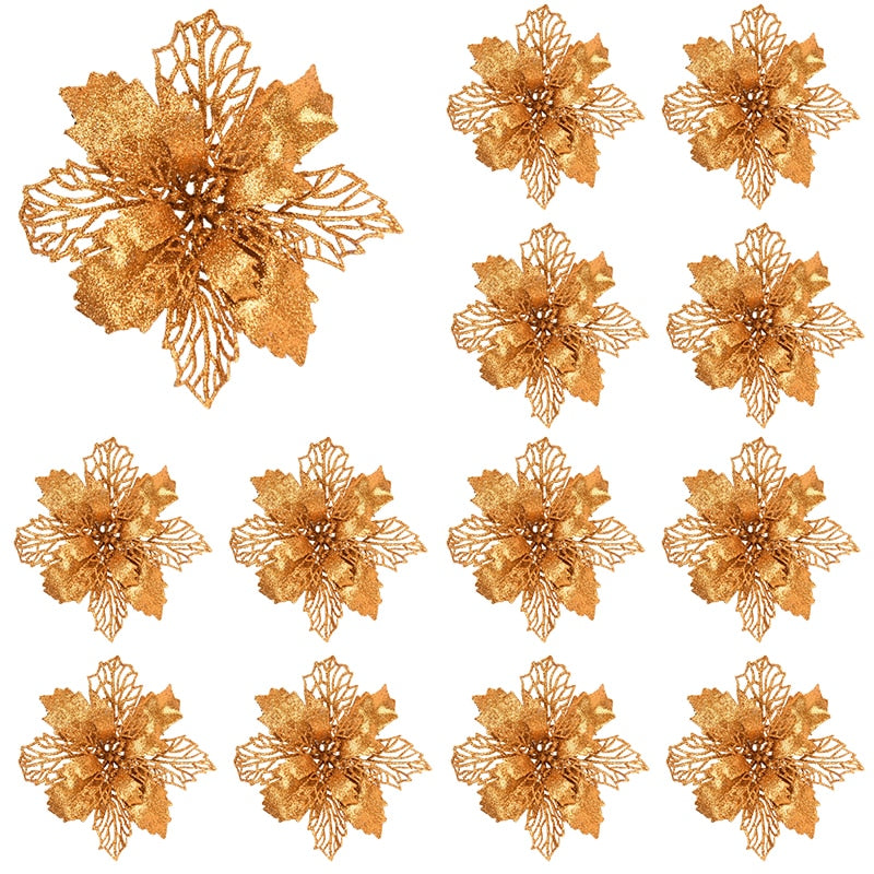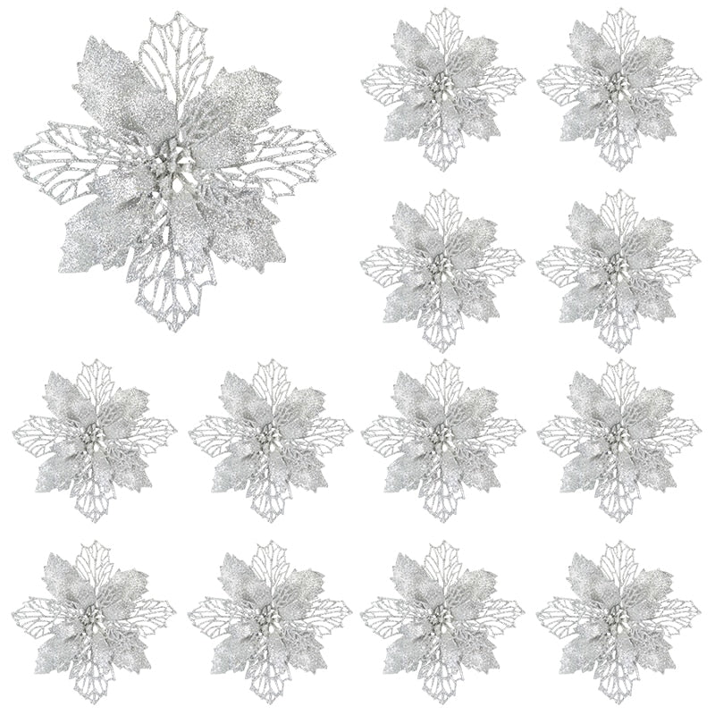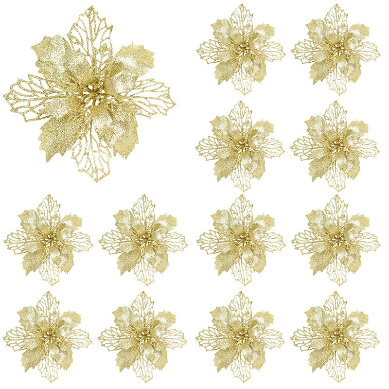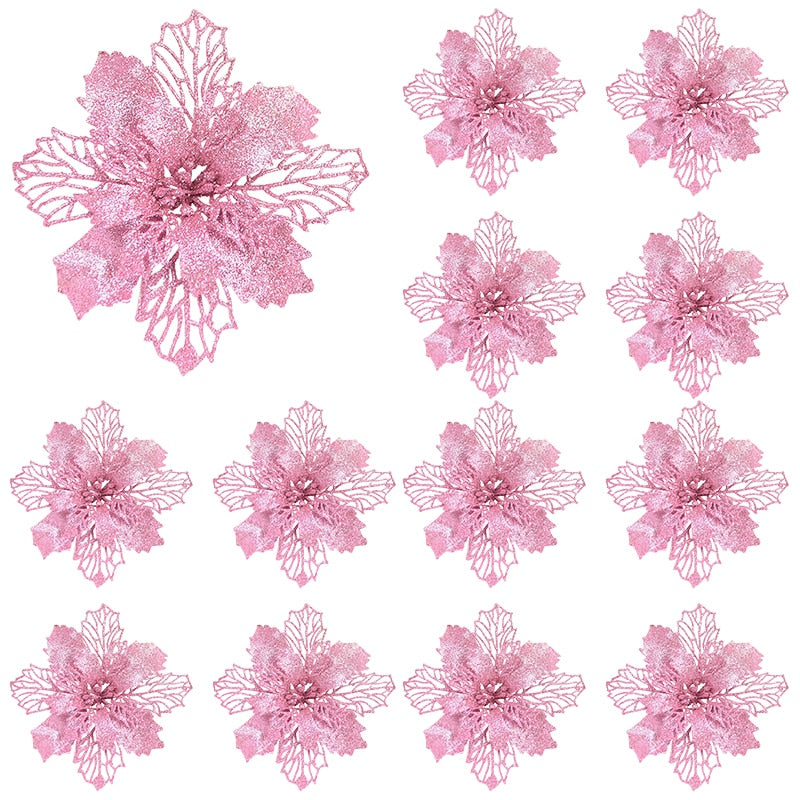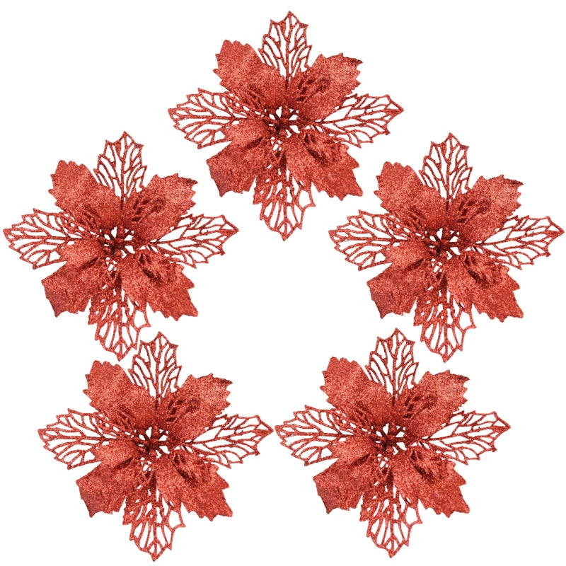 10pcs Glitter Artificial Poinsettia Flower with Berry Wedding New Year Christmas Cherry Flower Decorations Xmas Tree Ornament