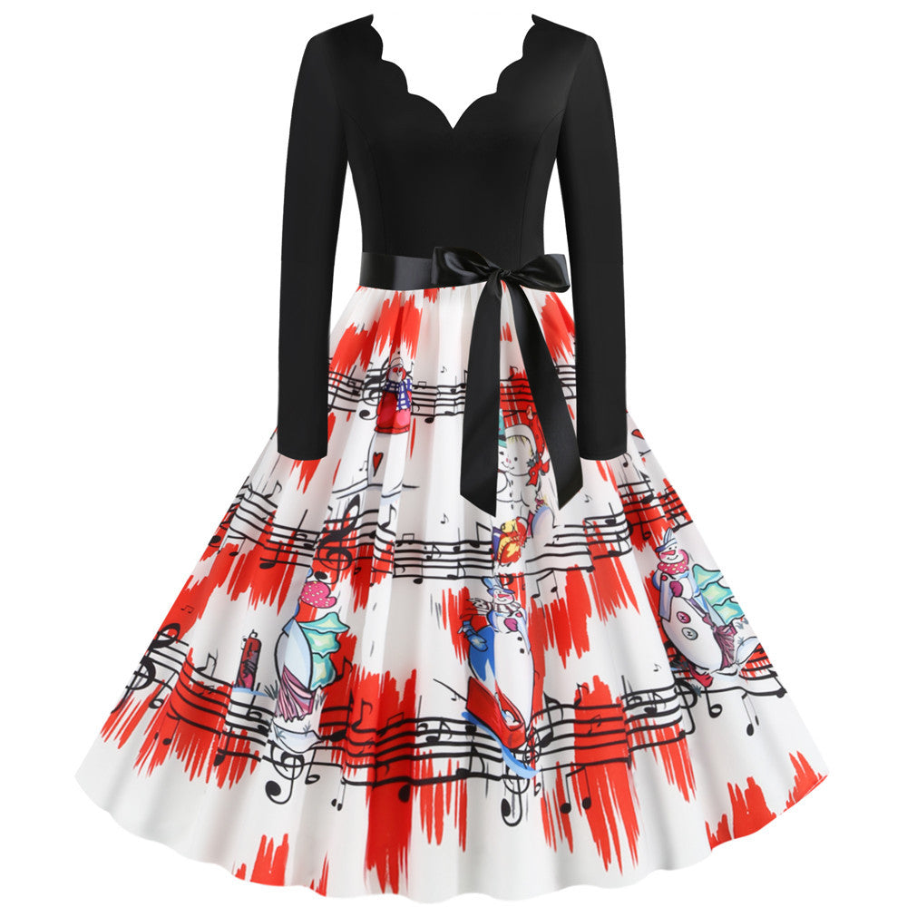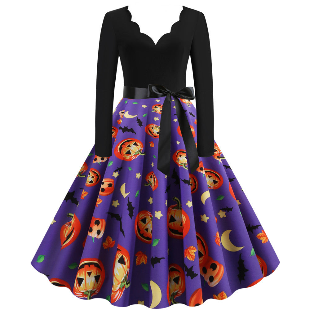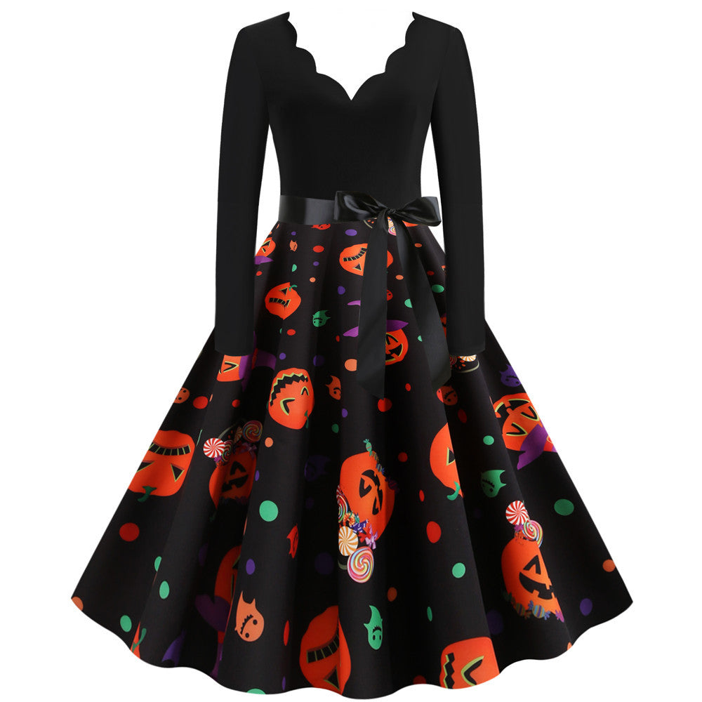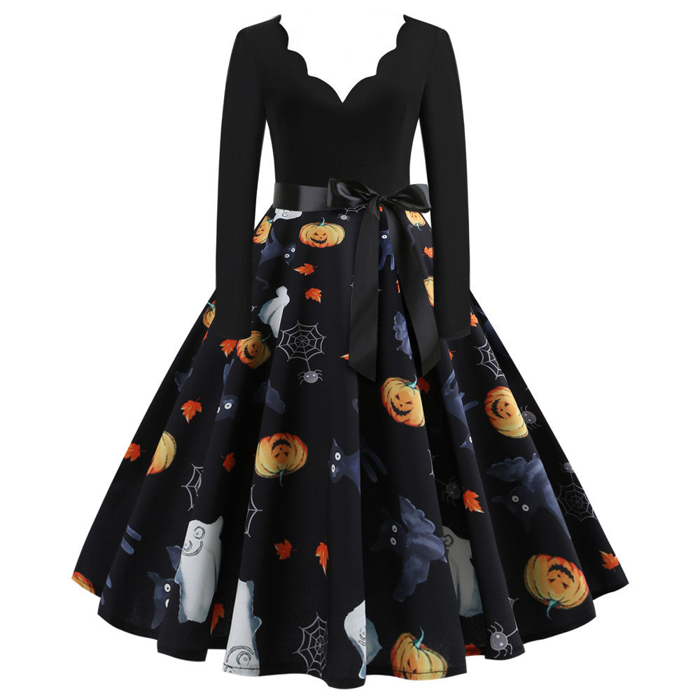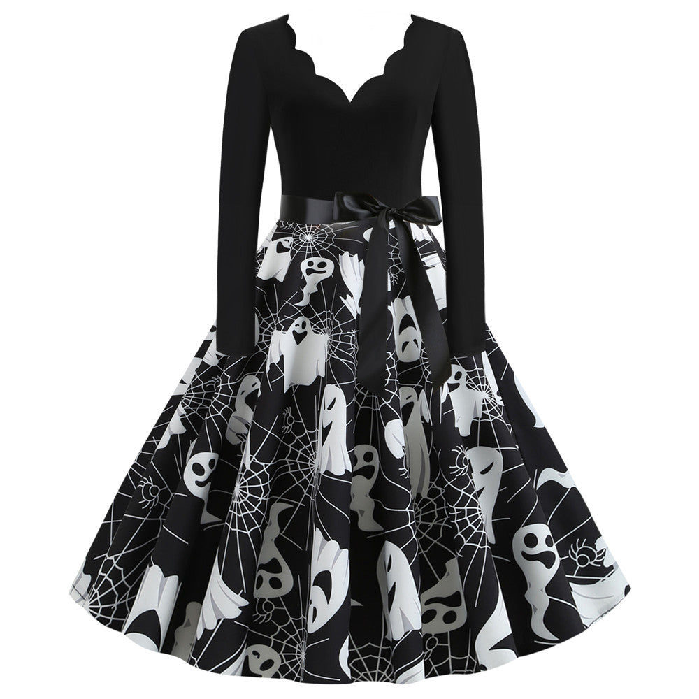 Halloween Burnt Flower V-neck Long-sleeved Sexy Print Big Swing Dress
