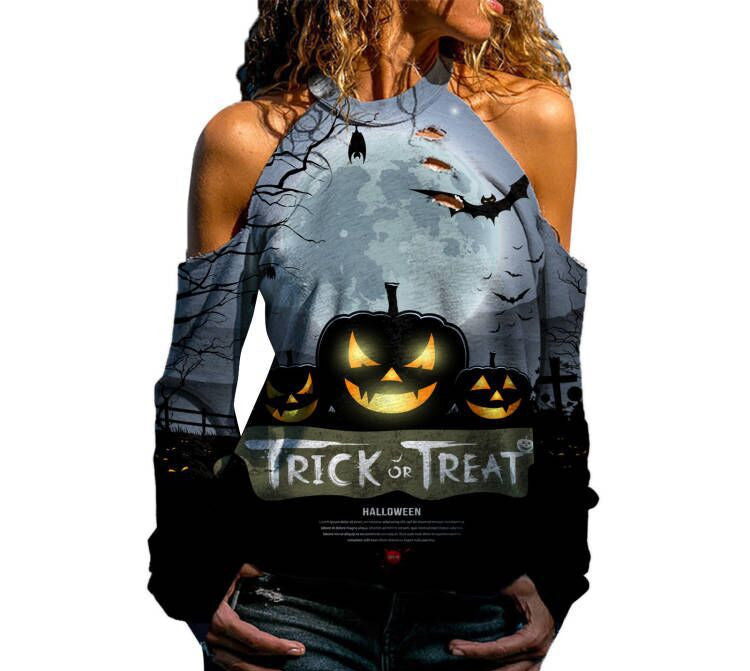 Halloween Off Shoulder Printed Top Womens Casual Loose Stitching Long Sleeved T Shirt