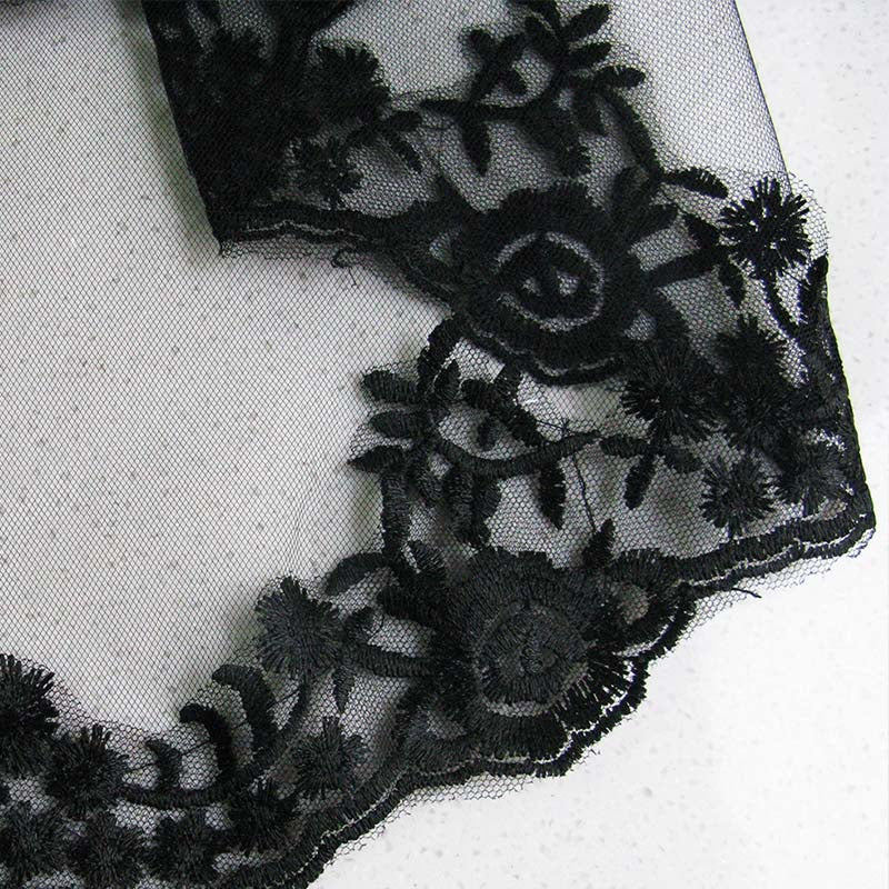 Enhance your Halloween witch costume with our stunning black lace veil! Made from high-quality single-thread polyester mesh and delicate lace, this double-layer lace insert combing yarn veil is the perfect accessory to complete your look.