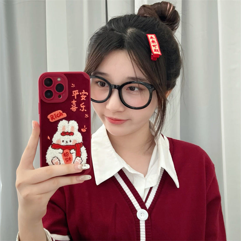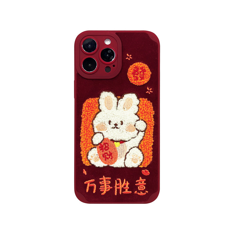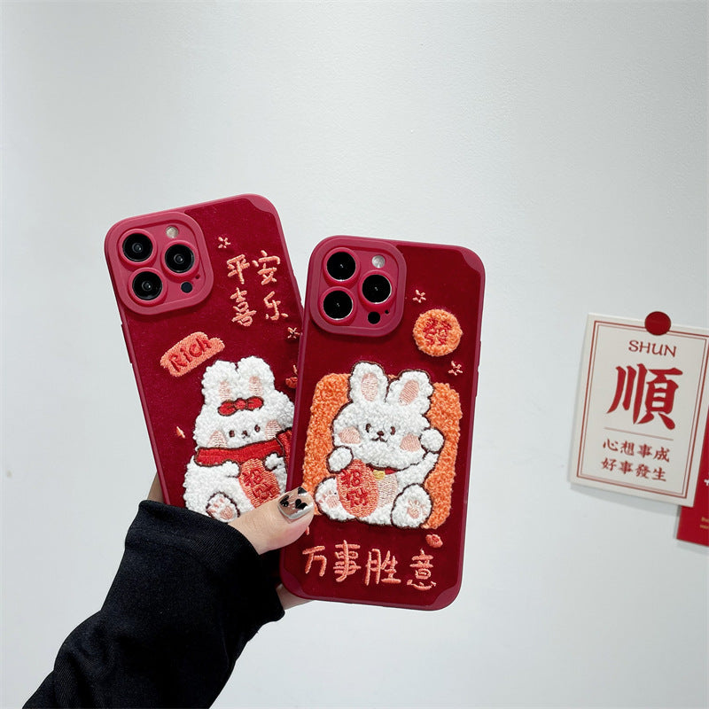 The rich and furry design of the New Year Red Embroidery Charm Rabbit Phone Case symbolizes wealth and prosperity, making it a perfect accessory to bring good luck and fortune in the coming year. The vibrant red color further enhances the auspiciousness of this phone case, representing joy and celebration.