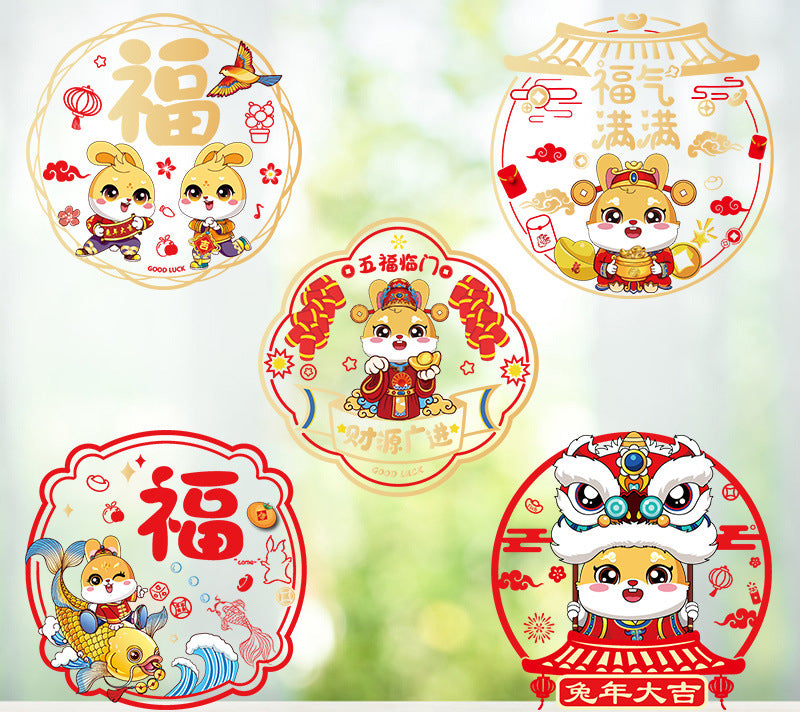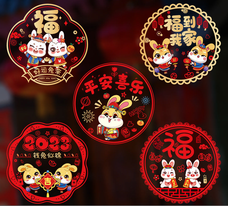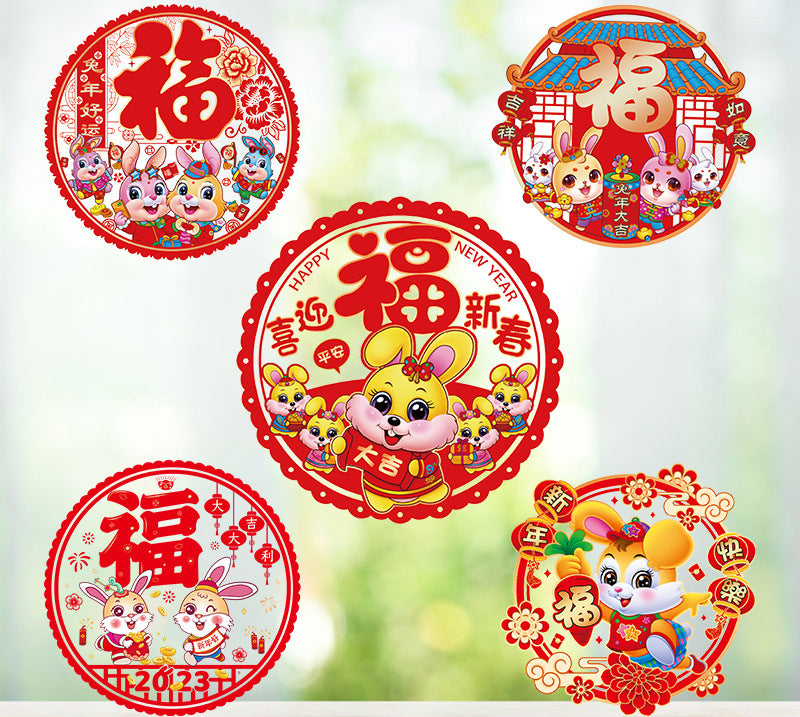 Rabbit Year Door Sticker New Year Decorations Paper Cut Window Flower Chinese New Year Static Sticker Glass Paster New Fu Character Sticker