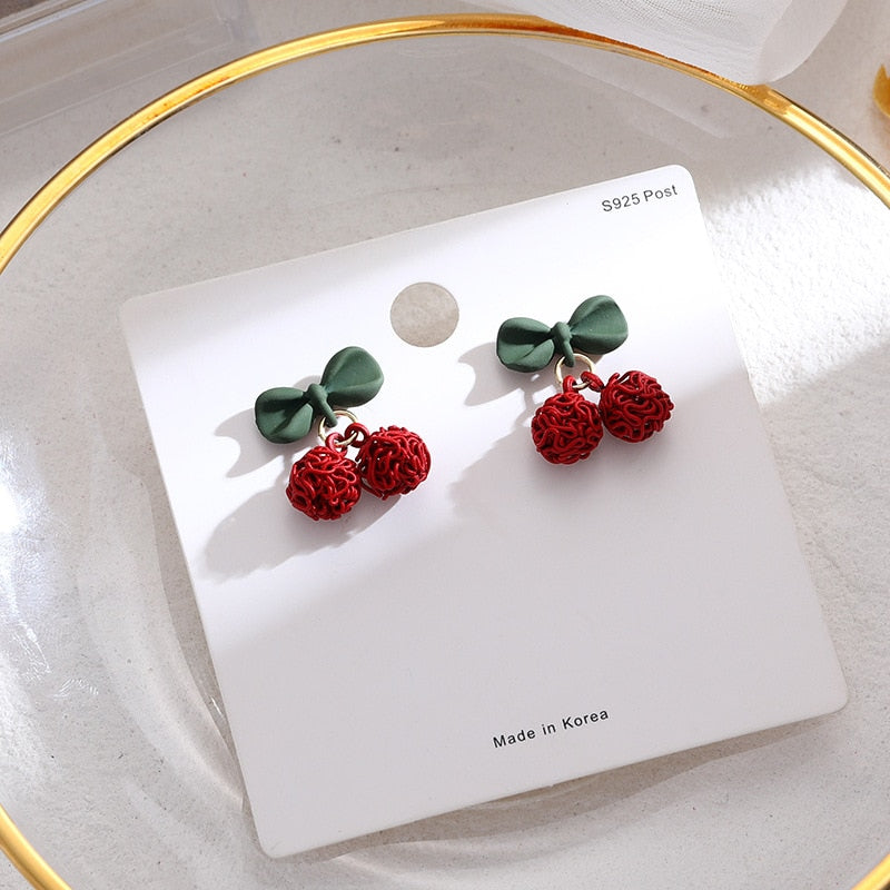Luxury Gold Color Zircon Bowknot Stud Earrings For Women Pearl Cherries Fruit Red Festive Earring Girls Christmas Jewelry Gifts