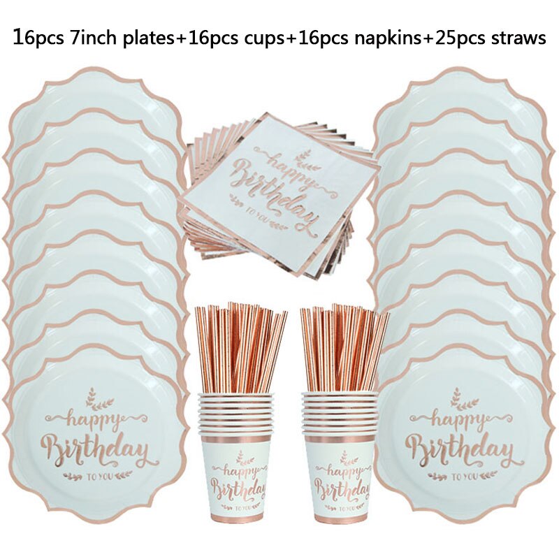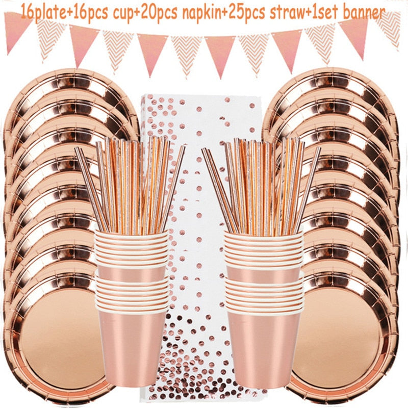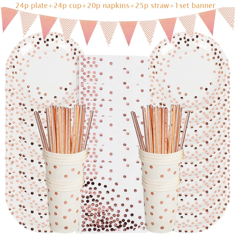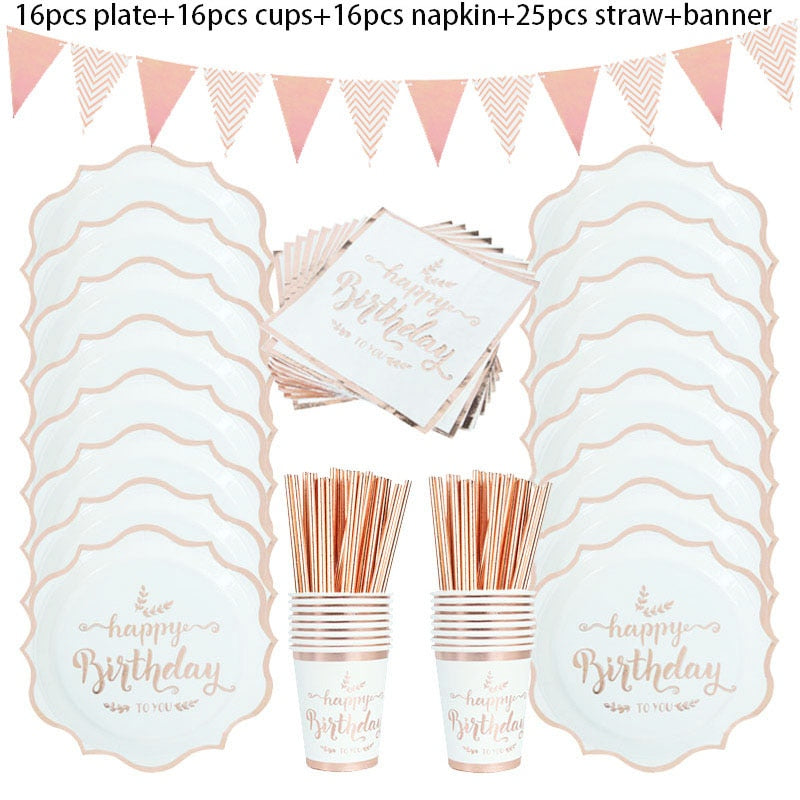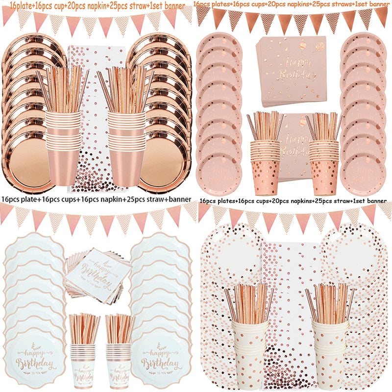 Rose Gold Birthday Decorations Disposable Tableware Set Paper Cup Adult Wedding Birthday Party Decorations Kids Babyshower Girl