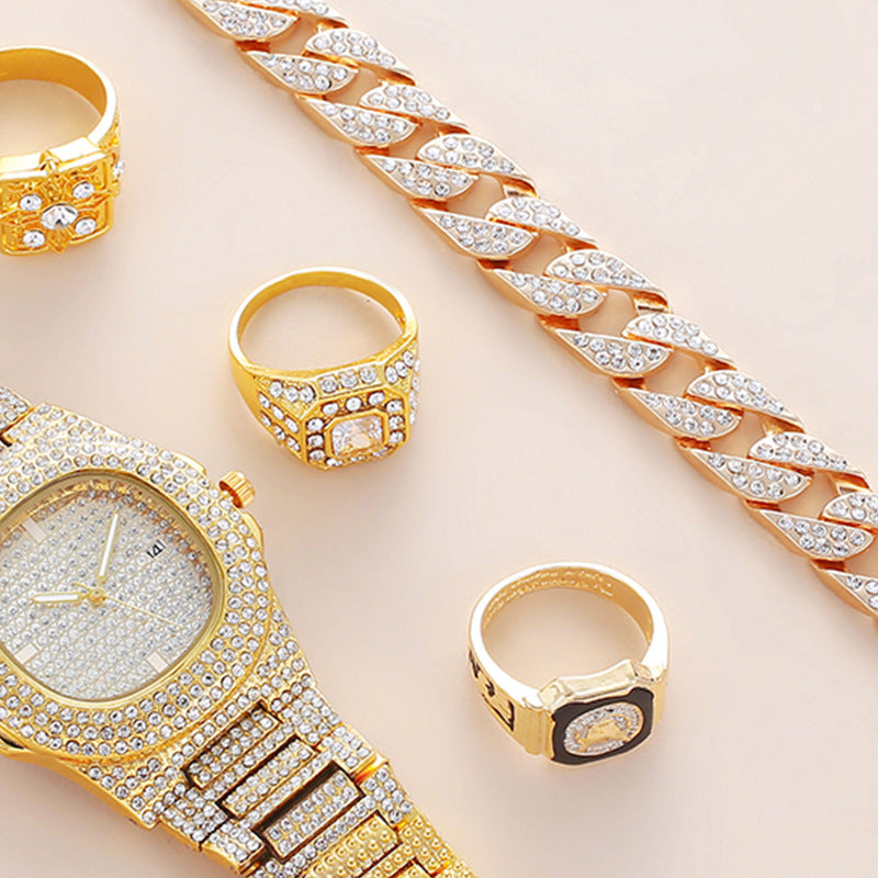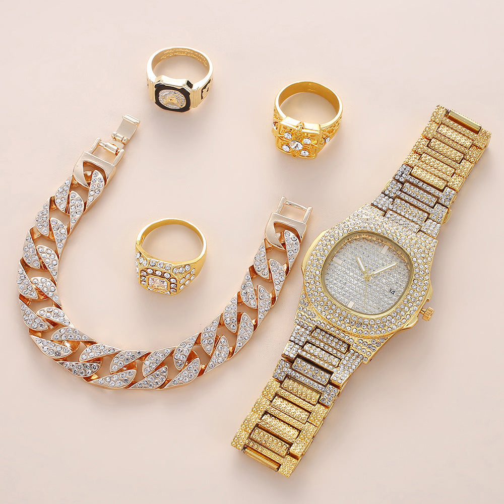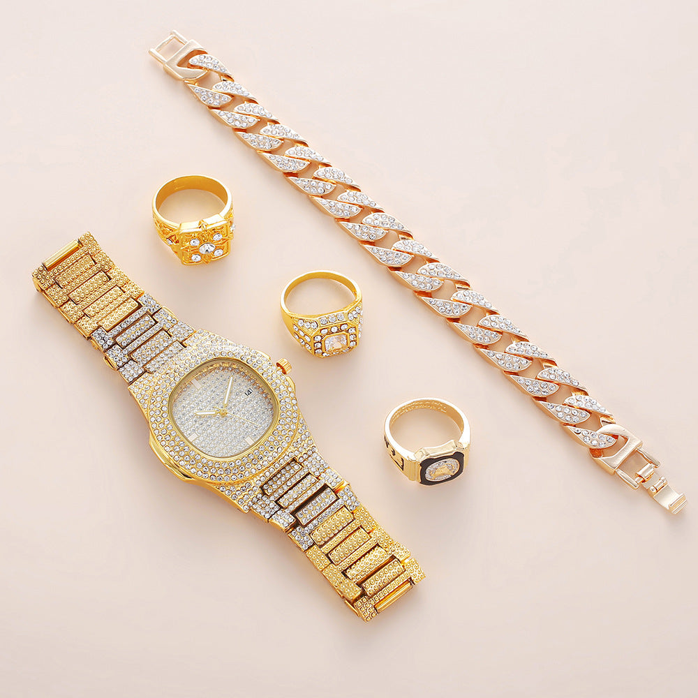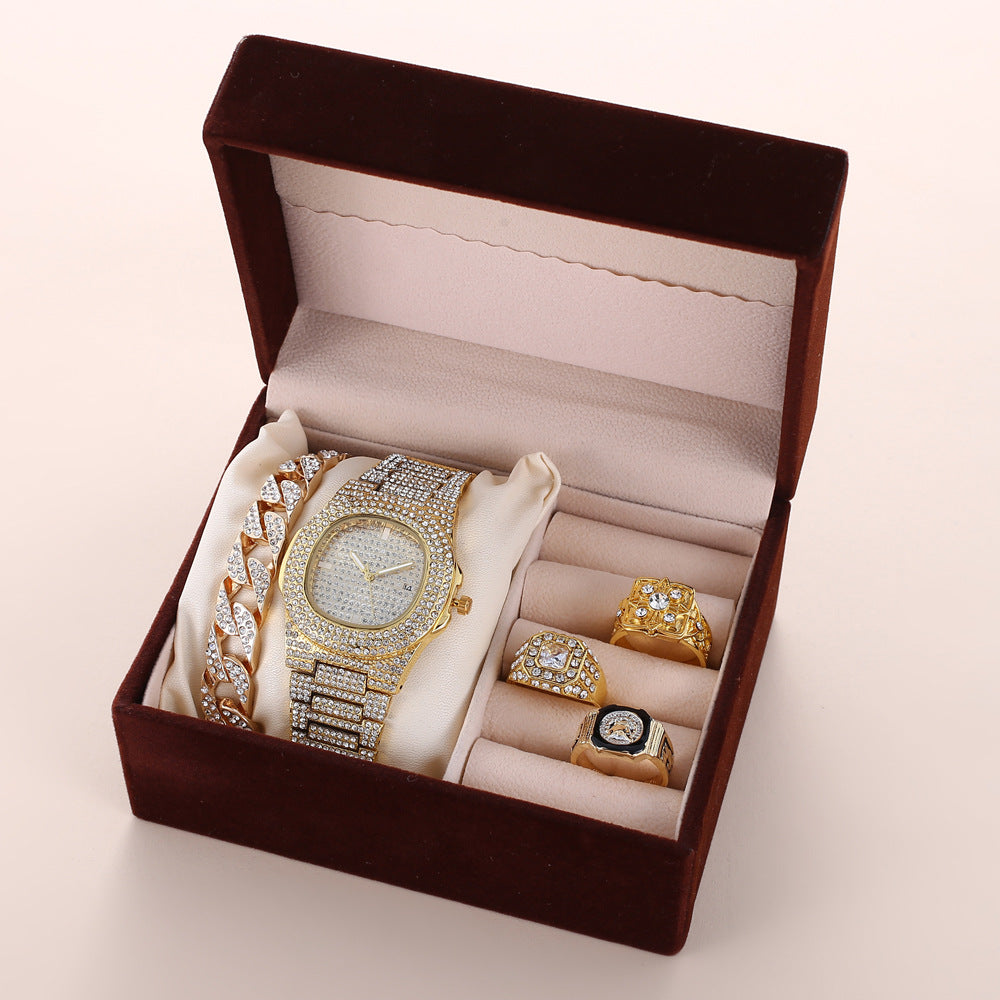 In addition to the watch, this set includes a bracelet and three rings, making it a perfect gift for a loved one. The packaging list includes one watch, one bracelet, and three rings, ensuring a complete and thoughtful gift set.