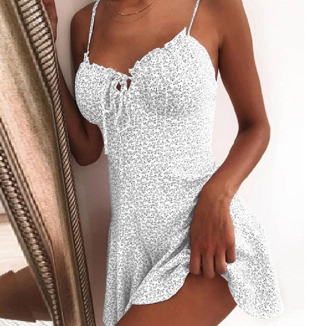 Summer Tie Front V Neck Elegant Sexy Floral Print Mini Dress Women Off Shoulder Ruffle Party Dress Femme Backless A-Line Dresses