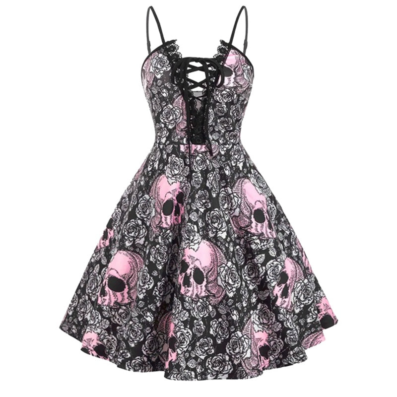 Featuring a unique skull print, this dress effortlessly combines a touch of macabre with a retro flair. The intricate printing detail adds an extra layer of depth to the overall design, making it a perfect choice for Halloween parties or themed events. The dress is available in two classic colors - white and pink, allowing you to choose the one that best suits your personal style.