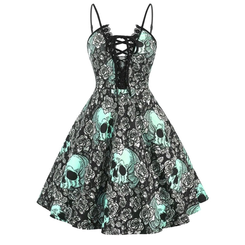 Women's Halloween Skull Print Sling Straps Waist And Large Retro Dress